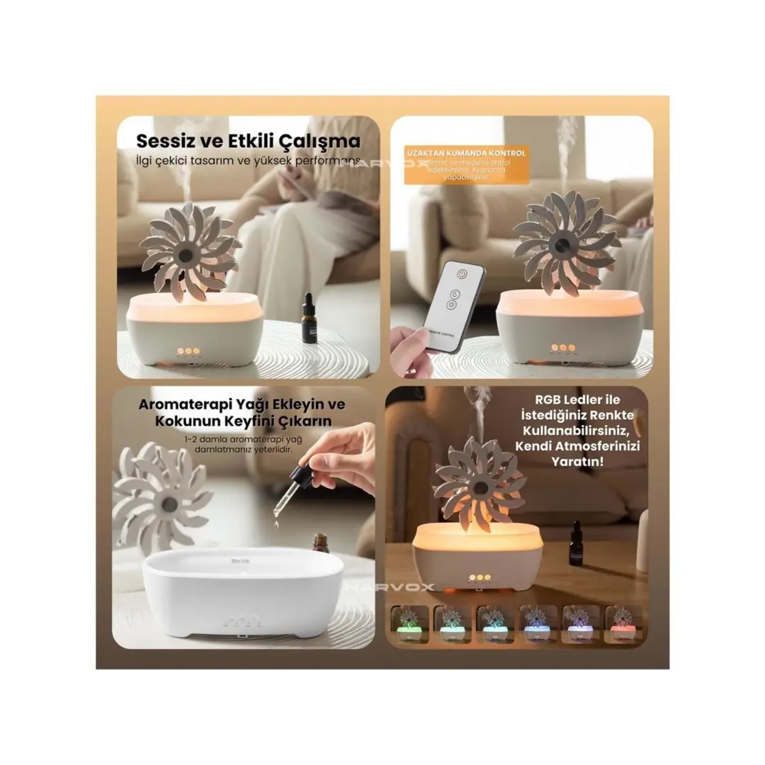 Bu 300 ml kapasiteli dönen değirmen terapi nemlendiricisi, havanızı nemlendirirken aynı zamanda hoş kokular yayarak rahatlatıcı bir ortam sunar. Uzaktan kumandası ve ışıklı tasarımı sayesinde kullanım kolaylığı sağlar ve evinize şık bir dokunuş katar.