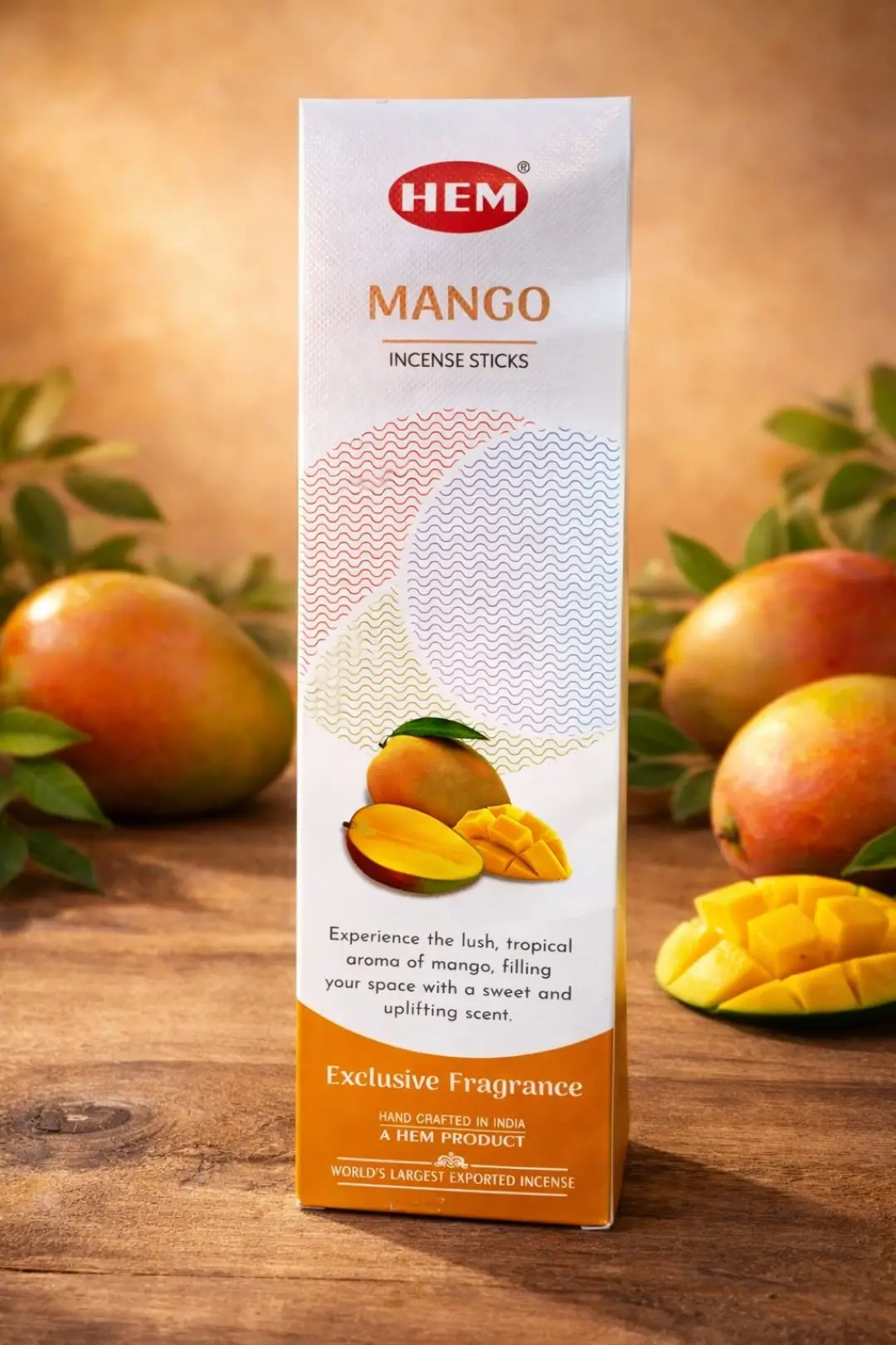 Ürün Özellikleri ● HEM marka, tamamen organik içeriklerle hazırlanmış çubuk tütsü ● Tropikal mango aromasıyla tatlı ve ferah bir koku yayar ● Karbon içermez, doğal bambu çubuk üzerine el işçiliği ile hazırlanır ● Ortalama yanma süresi: 50–60 dakika ● 1 pakette 15–16 adet çubuk vardır ● Yoga, meditasyon, gevşeme ve ortam kokulandırmada ideal kullanıma sahiptir